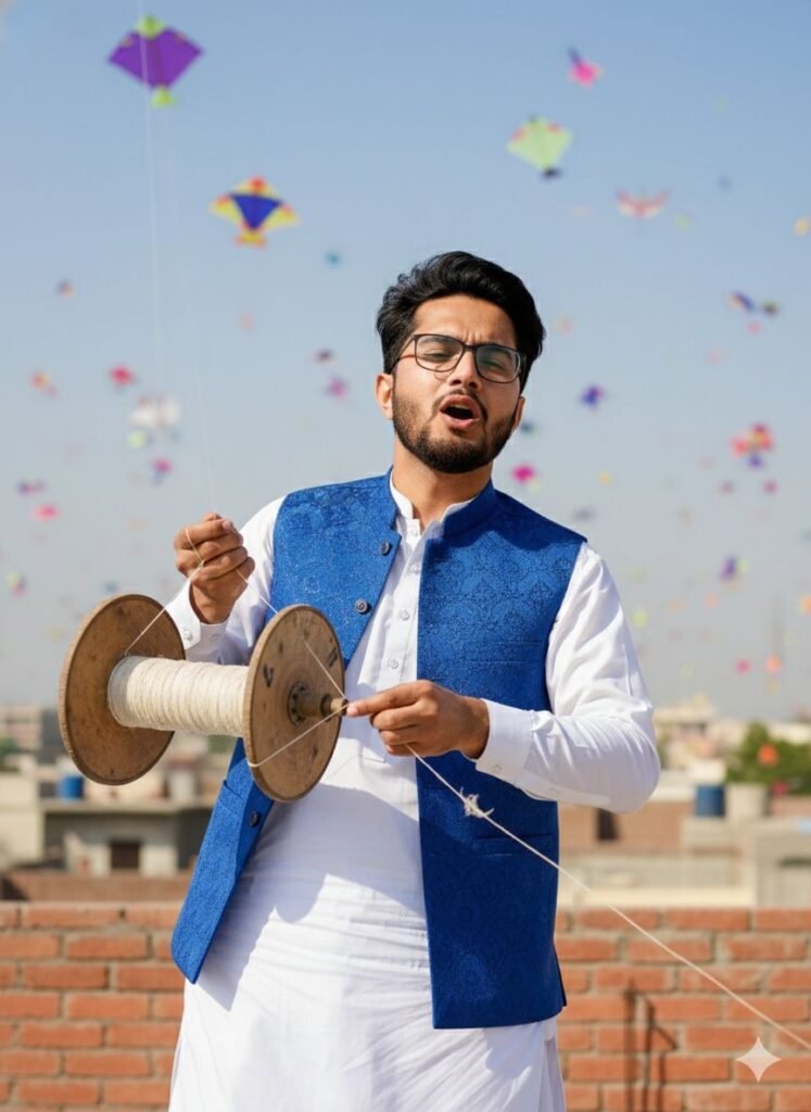 A hyper-realistic 8k photo of a [young man] standing on a rooftop in Old Lahore during the Basant festival. He is wearing a stylish yellow Kurta, holding a large traditional kite spool (pinna), and looking at the sky with a joyful smile. The background is filled with hundreds of colorful kites in a clear blue sky. Cinematic lighting, shallow depth of field, sharp focus on the face