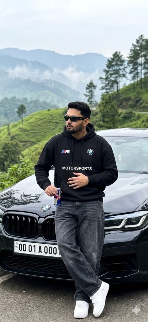 one large portrait from the chest up with arms crossed and a confident smile in the center, and one back-body image of me below wearing the same team jersey with white colour 44 [HAMZA TECH 30] on the back smiling.